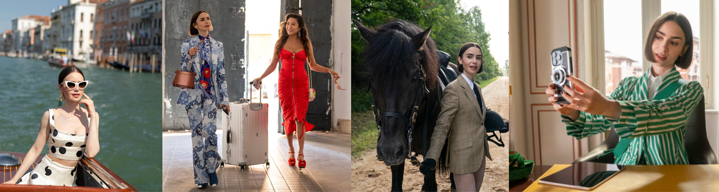 Además de mostrarnos París y mucha moda, la serie también se basa en hacer referencias a los momentos culturales, tendencias de consumo, cambios generacionales y lo que se viene. En 2024 mencionó el movimiento “Sober Curious” para dejar de tomar alcohol, que estuvo en auge en los últimos años. También apareció Emily corriendo con auriculares con cable (la nostalgia de los millennials) y el auge de la venta de ropa second hand. No es un spoiler, pero este año hicieron referencia a la moda de los conventos (hablamos del #MonkMode en GRWM), la comida plant based, la obsesión por mostrarse como empresas sustentables, el quiet luxury, el auge de las carteras de lujo fake, los dupes y… hasta acá llegué porque recién vi cuatro capítulos. En fin, Emily in Paris vende una fantasía, esa es la intención de sus creadores y también de la vestuarista. Los outfits se volvieron tan icónicos que, con la marca de “libros de lujo” Assouline, para el lanzamiento de esta temporada sacaron una edición con todos los looks y el proceso creativo detrás. Además de ser una producción agradable, que retrata nuestra cultura actual, la serie es un negocio redondo. Funciona como una máquina de facturar, no solo por las suscripciones de Netflix, sino por la publicidad integrada, que cuando se hace bien, funciona.