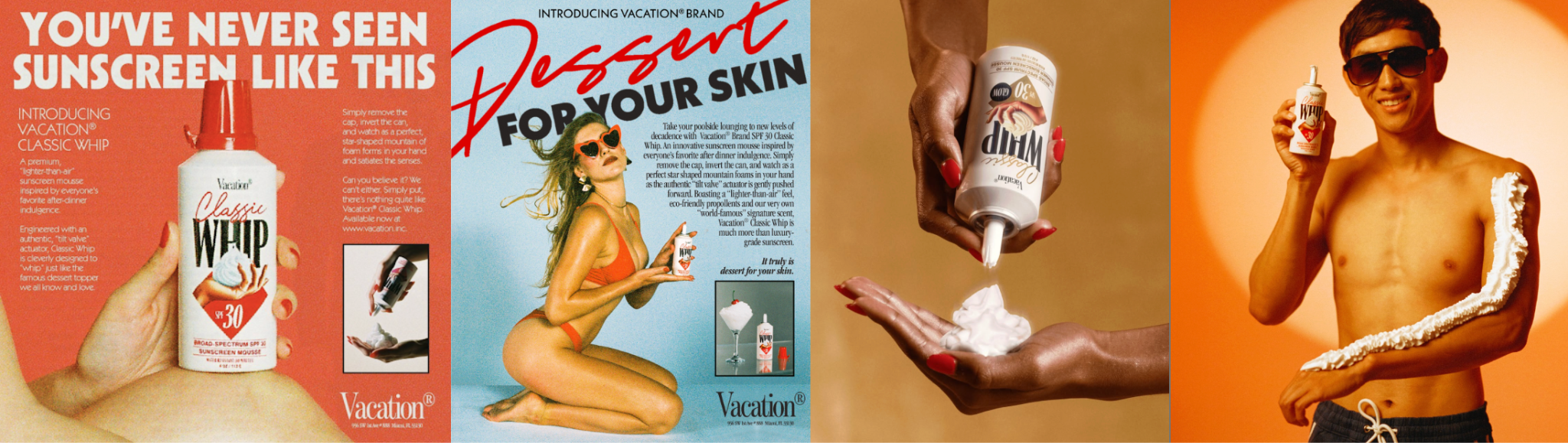 En 2021 juntaron $1.5 millones de inversión y arrancaron con Vacation vendiendo DTC en su web. Su Classic Lotion SPF 30 se presentó con estética ochentosa y una frase impresa que lo decía todo: “World’s Best-Smelling Sunscreen”. Luego llevaron esa lógica al extremo con el Classic Whip, un protector solar en espuma con envase de crema batida. Se la jugaron y les salió muy bien, era algo inesperado, divertido y fácil de hacer contenido en redes. Así siguieron muchos productos más, desde perfumes, velas y hasta revivieron el clásico gel bronceador Orange Gelée de Bain de Soleil, descontinuado en 2019 (con más de 16.000 personas en su waitlist y agotando en 3 días).