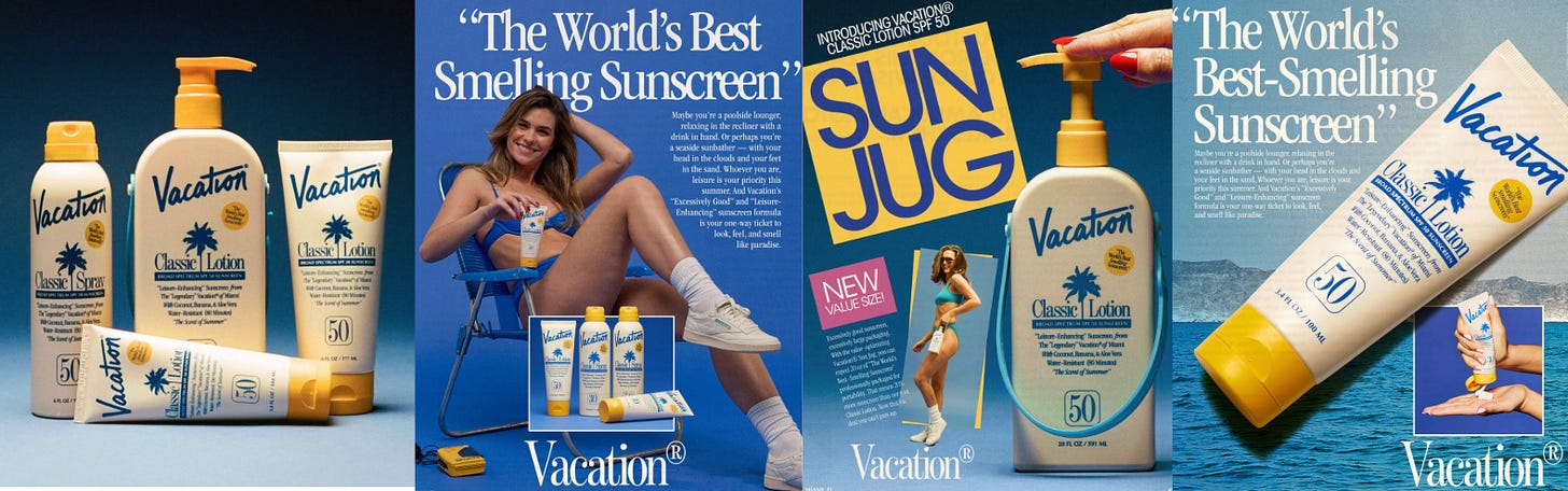 Dado que muchos están disfrutando el verano en el hemisferio sur (les cuento que acá en NY hoy hicieron -13°C de térmica), me parecía un buen momento para contar el caso del protector solar Vacation. Todos los protectores solares, tienen una misma estética super clean y formal; quieren vender ser de calidad con su packaging, mostrar la seriedad de ser aprobados por dermatólogos, y ser ideales para determinados tipo de piel. Vacation es una marca que apostó por hacer algo distinto y no para de crecer. La historia es otro ejemplo de cómo en CPG, el packaging y el diseño funcionan para diferenciarse de la competencia y ganar mercado en categorías super saturadas.