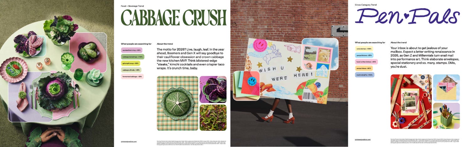 [FUN FACTS!] Leí todo el reporte y como fun facts, que no son de fashion ni beauty, pero no quería dejar de compartir, hay dos que me llamaron la atención: 1) en la sección food aparece el repollo como el nuevo ingrediente fetiche que vamos a ver en todos lados, así como pasó con el coliflor o el pistacho; y 2) la vuelta de las cartas escritas a mano y enviadas por correo. Todo 2025 hablamos de cómo a las generaciones más jóvenes les gusta coleccionar DVDs, CDs, cassettes, usar auriculares con cable, Pokémon y esa estética de los 2000s, y ahora esa nostalgia también incluye escribir a mano.