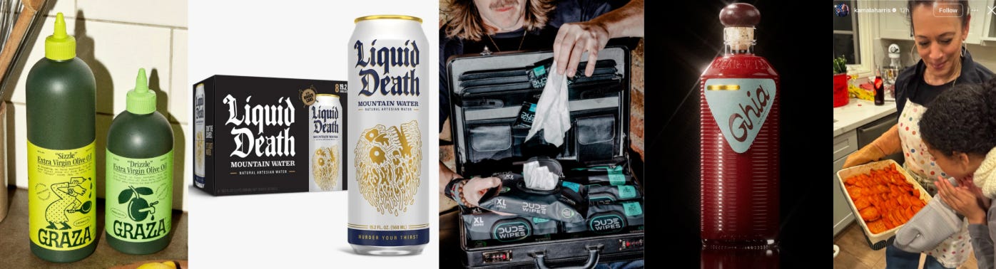 En el mundo Direct-To-Consumer (DTC), el packaging es el gran diferenciador en mercados saturados: no solo es el primer punto de contacto con el cliente, sino que hoy es una pieza clave por su potencial viral. Un diseño disruptivo refuerza la identidad y tracciona crecimiento orgánico de forma directa. Casos como Graza o Ghia (que la está rompiendo con sus aperitivos sin alcohol) son ejemplos perfectos. Los reconocemos en las cocinas de los influencers y, muchas veces, no se trata de un canje o publicidad paga; simplemente aparecen en fotos íntimas de su día a día. Por ejemplo, en los videos de cocina de Gwyneth Paltrow es imposible no notar el verde llamativo del aceite Graza de fondo. O incluso en Thanksgiving, cuando la ex-vicepresidente, Kamala Harris, subió una foto familiar y se veía claramente la botella de Ghia. (dato de color: soy re fan de su fundadora! El otro día coincidimos en un café y casi me muero cuando la vi, pero no me animé a decírselo).