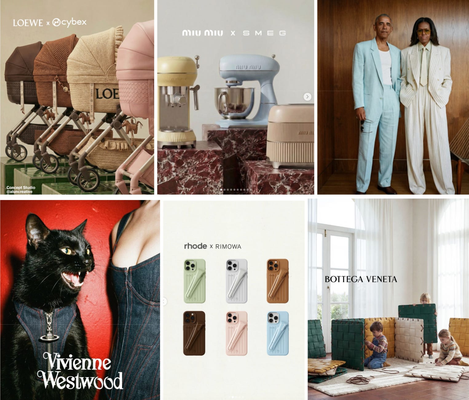 Lo que es impresionante, es la velocidad con la que estas creaciones se viralizan en las redes, superando en métricas a los anuncios o publicaciones reales de las marcas. Esto muestra que a pesar de que hoy la gente dice rechazar el contenido generado por AI a favor de lo auténtico y artesanal, el comportamiento de los usuarios demuestra lo contrario. El dedo (y los ojos, Chico) no mienten; los usuarios eligen interactuar con estas visiones imaginarias y aspiracionales, dejando de lado la preocupación por si el producto existe o no. Otros conceptos que se viralizaron recientemente: 1) un cochecito de bebe con accesorios - collab entre Loewe y Cybex; 2) electrodomésticos - collab entre Miu Miu y Smeg; 3) los Obamas fashion show; 4) ropa para gatos - Vivienne Westwood ; 5) fundas de smartphone - collab entre Rhode y Rimowa; 6) deco para chicos - Bottega Veneta.
