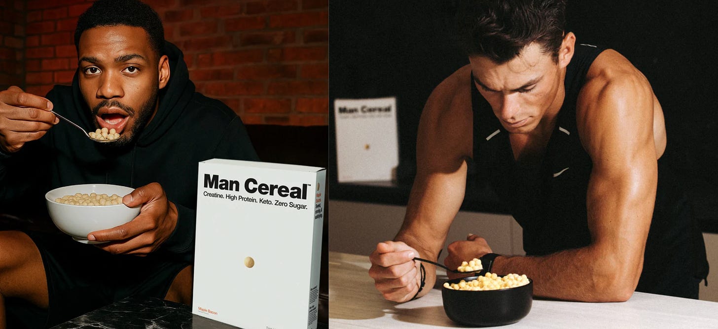 Hoy los ingredientes de moda que monetizan las marcas son la proteína, la creatina y la fibra. Y hay una marca que decidió meter los tres juntos en un solo producto, los cereales. Se llama ‘Man Cereal’, y no es casualidad que lo hayan posicionado como un producto para hombres. Los dos founders vienen de trabajar en ‘Dr. Squatch’, una marca de productos masculinos que se volvió viral, entre otras cosas, por sus campañas de marketing con Sydney Sweeney. Identificaron que los cereales son un alimento que los hombres aman de chicos y dejan de comer cuando se hacen adultos. Principalmente porque son puro azúcar, tienen carbohidratos, y no encajan con ninguna dieta saludable moderna. A medida que cambiaron las tendencias, el cereal del adulto pasó a ser la granola, pero no es lo mismo. Ya había una marca que intentó algo parecido con poco éxito, Magic Spoon, pero tiene una estética más femenina y nunca terminó de pegar con los hombres (yo probé varios sabores allá por el 2020 pero no me gustó). Entonces tenían la idea, el expertise en posicionar productos para ese mercado, sabían que no había nada igual disponible y veían crecer el fenómeno de los gym bros y su obsesión con la dieta.