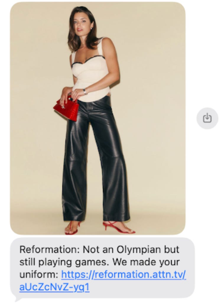 Y ahora vayamos a lo importante, su marketing. Reformation se distingue por su tono a la hora de comunicar, con mensajes de texto y newsletters con subjects imposibles de ignorar (ej. “GET YOUR HANDS DIRTY, SHOW YOU OFF”). Lo logran porque están al tanto de todo lo que pasa en internet, de las tendencias y de lo que están consumiendo sus clientas, pero lo que las diferencia del resto es que actúan rápido. Un buen ejemplo fue lo que hicieron durante las Olimpíadas, que destacó la experta en marketing Ari Murray, es que Reformation encontró la forma de hablar del momento sin salirse de su estilo, sin necesidad de vender ropa deportiva.