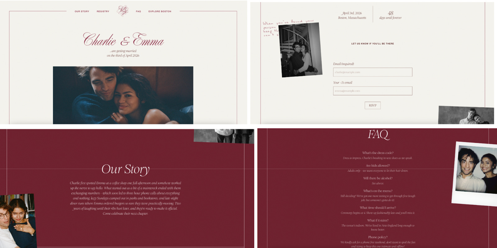 Lo que más me gustó fue que aprovecharon San Valentín para lanzar una página web del casamiento, donde la gente puede hacer RSVP, ver la historia de cómo se conocieron, FAQs / preguntas frecuentes, la lista de regalos y tips de qué hacer en Boston (como si fuera un ‘destination wedding’).
