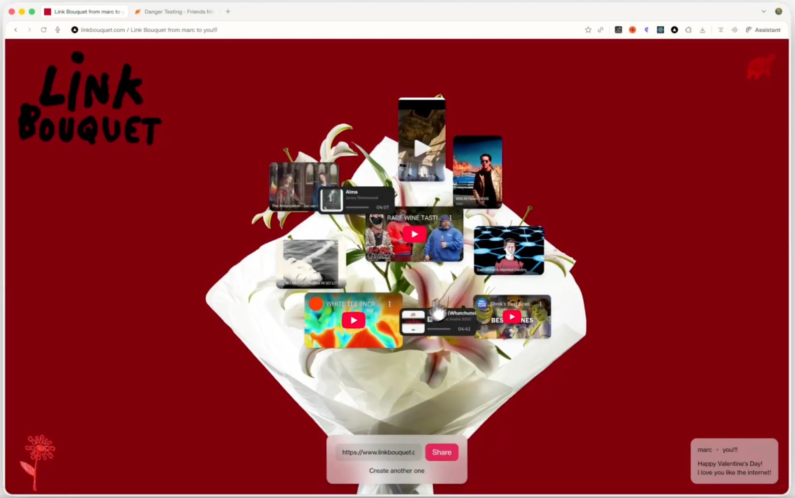• Un ramo de links para San Valentín | Marc lanzó Link Bouquet un par de días antes de San Valentín. El proyecto es una página web que transforma links de internet en un ramo de flores digital para mandarle a otra persona. El concepto es así, elegís el tipo de flores, el color del fondo de pantalla, pegas links de las cosas que se te ocurran (videos de YouTube, canciones de Spotify, artículos de noticias, productos, etc), escribís una nota/dedicatoria y se los compartís a alguien especial. También agregaron una sección estilo galería para ver los ramos que crean los distintos usuarios. Se volvió viral al toque; el post original en X pasó las 500 mil impresiones en horas. A la gente le encantó que el proyecto tenga una mezcla de romanticismo low-tech con creatividad de la cultura de internet. Otro proyecto parecido que explotó esta semana fue DigiBouquet. Pauline, la creadora, dijo que tuvo tal éxito que casi tiene que dar de baja la página porque la cantidad de tráfico que recibió (+1M de usuarios en un par de días) hizo que se dispare el costo de mantenerla funcionando. Cosas que te cruzas en internet y que te sacan una sonrisa.