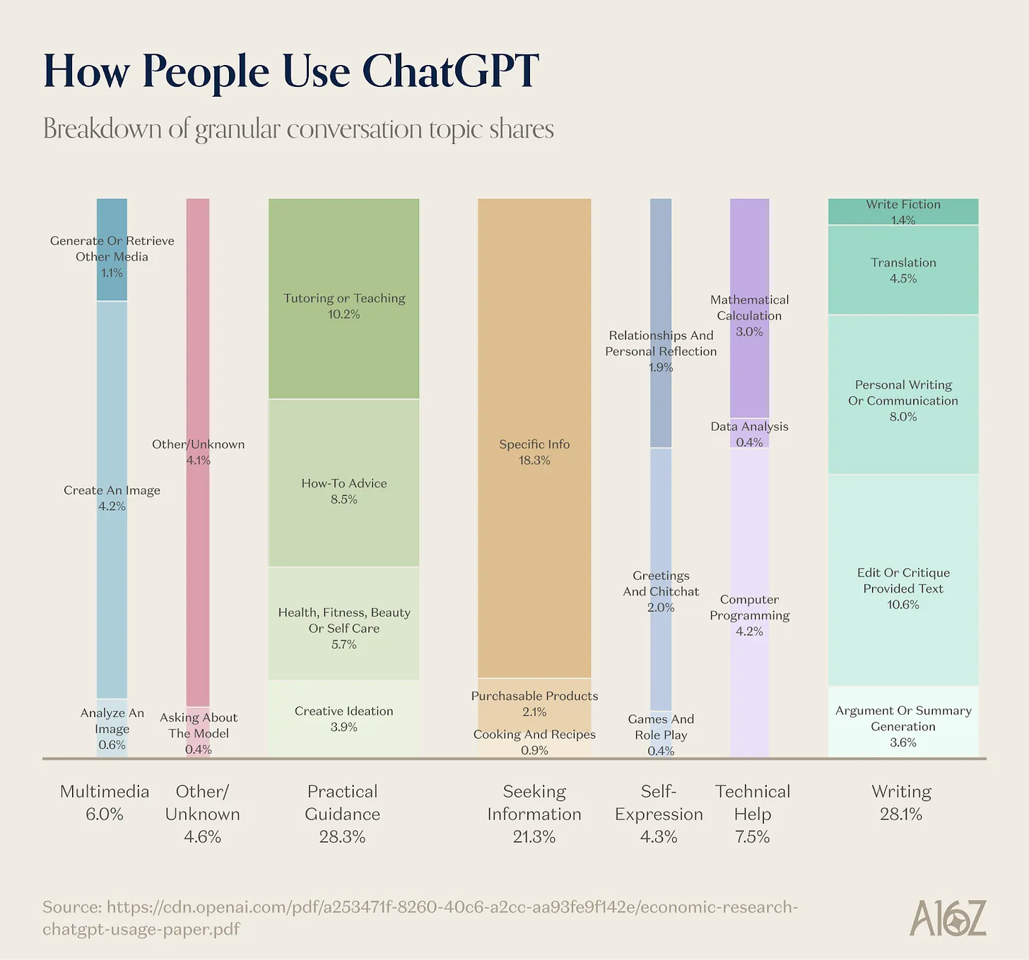 • ¿Para qué usamos AI? | En un nuevo artículo de A16Z, la empresa muestra un análisis sobre los usos que la gente le da a ChatGPT. La gran mayoría usa AI para escribir, buscar información o recibir consejos, y solo una minoría lo usa para cosas más técnicas como programación o análisis de datos. El punto que quieren hacer, es que dados estos porcentajes, es inevitable que el principal modelo de negocio para monetizar ChatGPT sea a través de anuncios. Un programador no tiene problema en pagar $20 o $200 dólares de suscripción para usar AI porque entiende que el valor que puede producir es mucho mayor, pero la gran mayoría de la gente no va a estar dispuesta a pagar una suscripción por algo que estaba acostumbrada a que sea gratis, por ejemplo Googleando. Así es que pareciera que la única forma de mantener los costos que implican que ChatGPT esté disponible para todo el mundo, es integrando publicidad. Al final del día, los anuncios siempre fueron el motor de la economía de internet.