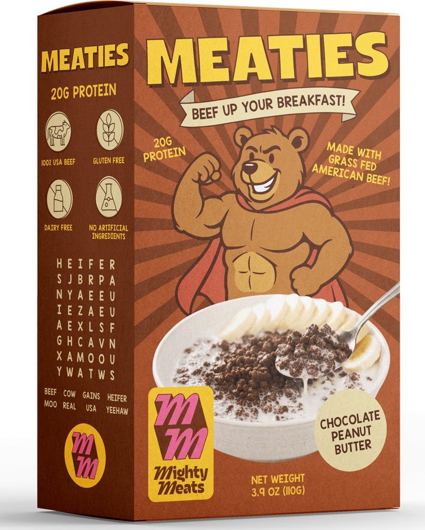 • Packaging de la semana | Cuando conté el caso de Man Cereal hablamos de que la categoría cereales había quedado encasillada en comida de chicos, o muy asociada con los frutos secos. Muchos hombres dejaron de comer porque no tenían un producto que les de la fibra y proteína que necesitan. Se ve que realmente había una necesidad porque ahora aparecieron otros cereales con 20 gr de proteína pero con una gran diferencia… el ingrediente principal es carne. Las reacciones no fueron del todo buenas porque a la gente la shockeó esto de mezclar carne con leche. Pero según la marca el sabor es el de un cereal normal solo que no tiene whey protein agregado. Entré en la página para ver cuánto costaban pero me apareció la waitlist y un mensaje diciendo que su primera tanda estaba sold out. Se ve que escucharon el feedback y van a intentar con una receta nueva que los haga un poco más dulces y con más crunchy.