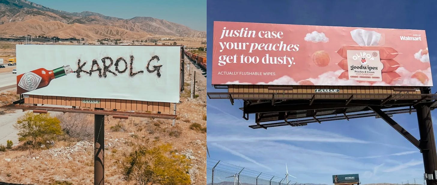 Así como en el Super Bowl las estrellas son los ads durante los cortes, en Coachella lo más esperado son los billboards en la ruta hacia el desierto. La gente les saca fotos y se viralizan en las redes. Cada persona que va a Coachella tiene que pasar por esa ruta. Las marcas lo saben y por eso compiten para ver quien tiene el cartel más “shareable”. Muchos de los billboards más comentados son publicidades de los artistas que tocan en Coachella, como Sabrina Carpenter, Karol G con la salsa Tabasco, y Major Lazer haciendo un chiste con Ozempic (hasta el día de hoy es el que más se viralizó). Entre las marcas que aprovechan a publicitar, me pareció original la collab entre Good Wipes con la gaseosa Olipop para unas toallitas con aroma Peaches + Cream; haciendo referencia Justin Bieber y su canción Peaches.