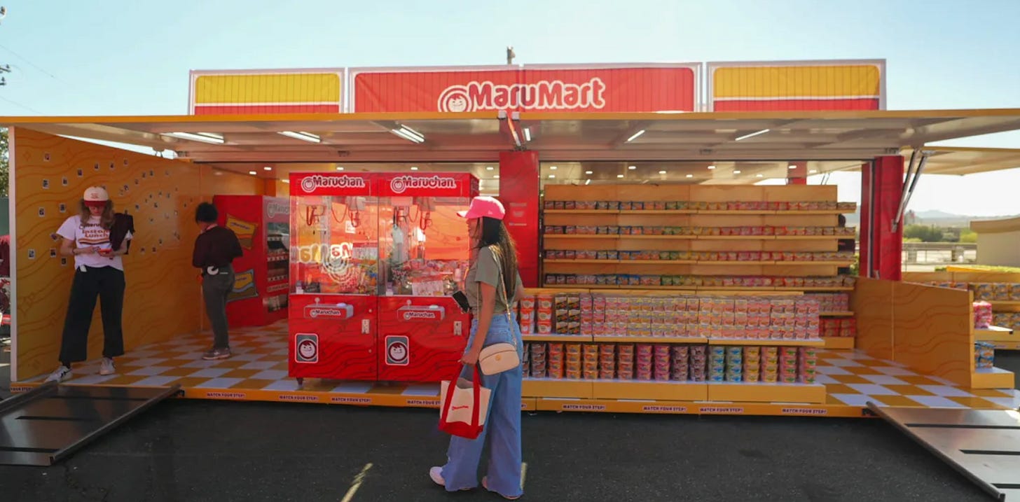 Otra forma de estar presente sin contar con el presupuesto para stands dentro de Coachella es haciendo activaciones en los alrededores, por ejemplo cerca del aeropuerto o de hoteles. Las marcas aprovechan para jugar con el “no me alcanzaba para estar en Coachella”. Maruchan, la de las sopas instantáneas, armó un pop-up estilo mini-market retro sobre la ruta. Me pareció divertido que para encontrarlo la gente tiene que pasar por un túnel de noodles. Generó mucho contenido en TikTok por la estética y lo divertido de la experiencia; la gente para a comer gratis, y de paso suben fotos y videos a redes. Además tienen las maquinitas típicas de Japón para sacar regalos.